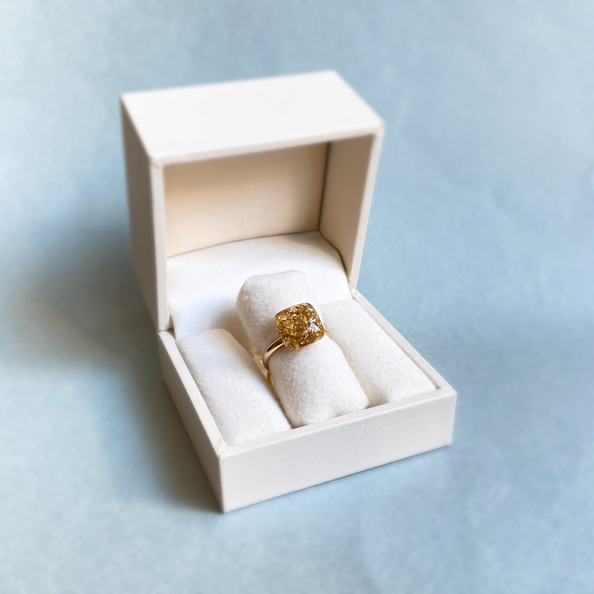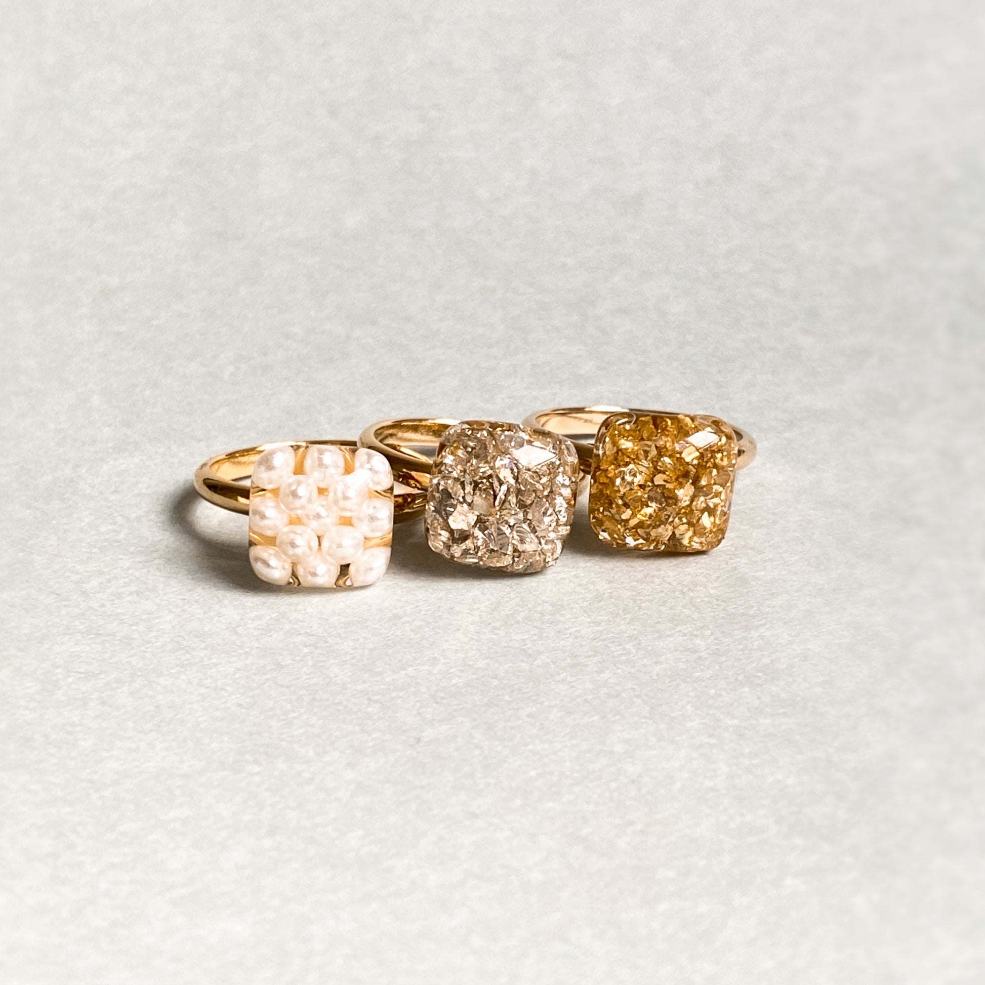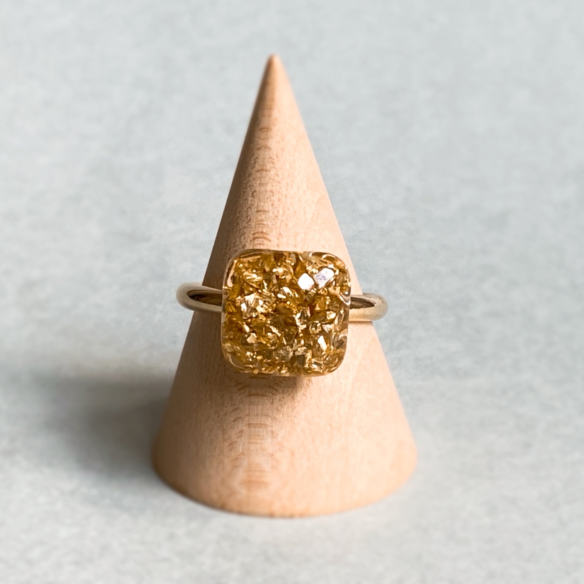 クリスタルの中にゴールドフレークをぎっしりと閉じ込めた、華やかでモダンなスクエアシェイプのリング。